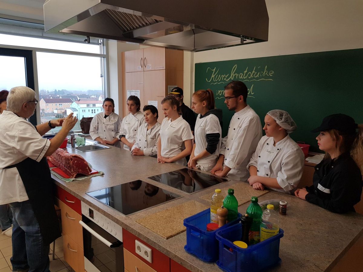 Am Freitag, den 09.11.18 reiste Fachlehrer Markus Pinapfel mit 5 Köchen der NGG10a an die sonderpädagogische Berufsschule nach Ettmannsdorf, um das gemeinsame Inklusionsprojekt „Rinderlende fachgerecht zerlegen und deren Fleischteile bestimmen“ durchzuführen. An der Schule angekommen, begrüßte die teilnehmende Lehrkraft und Fachbetreuerin, FOL Frau Bias, mit 5 Beiköchen die Gruppe aus Cham.
