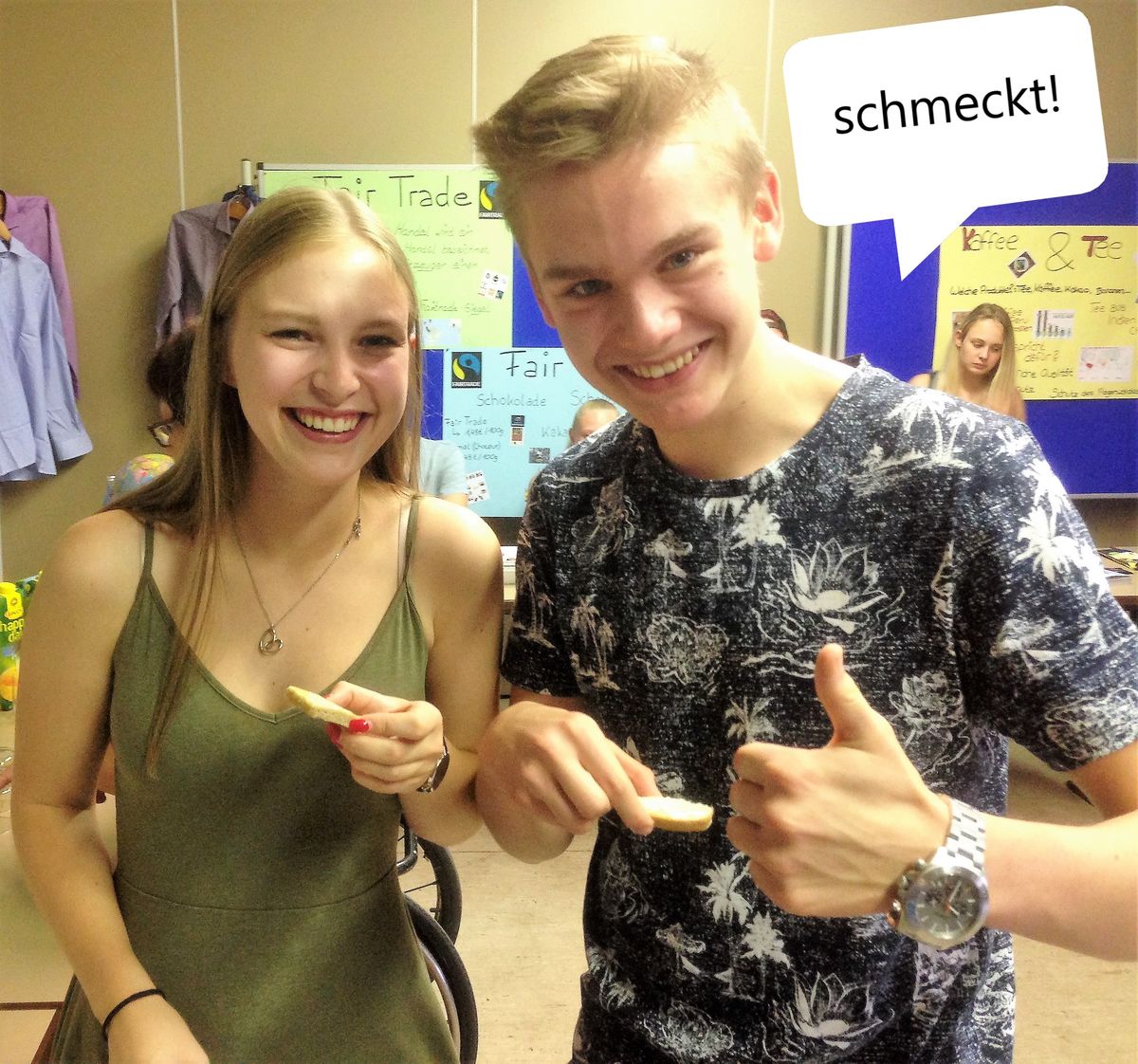 Im Rahmen einer kleinen Messe ermöglichen die Schüler der Klassen WEH 10a und 10d ihren Besuchern - Industriekaufleuten, Zahnmedizinischen Fachangestellten und BIK-Schülern - ein Erlebnis, das die Sinne anspricht: Blindverkostungen von Kaffee, Kaba und Schokolade fordern die Geschmacksnerven - genießt man gerade ein fair gehandeltes oder ein konventionell produziertes Lebensmittel? Auch bei Handtüchern und Oberbekleidung stellen wir die Messebesucher auf die faire Probe. Wir lassen uns außerdem Orangensaft und Bananennektar sowie Brot mit regional hergestellter Butter und Honig sowie fair gehandeltem Schokoaufstrich schmecken.