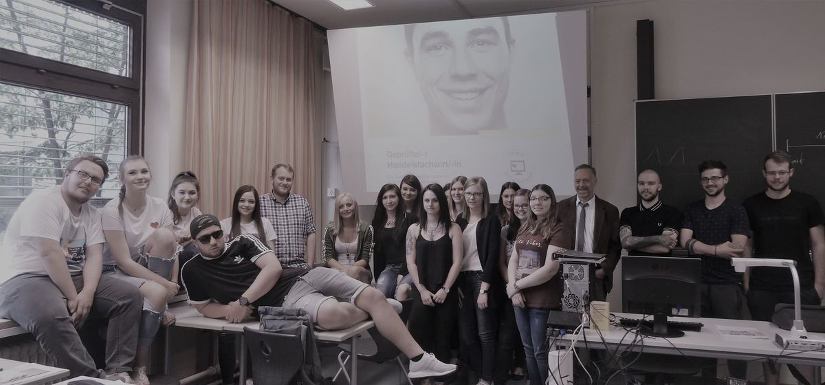 Dr. Rolle von der Akademie Handel in Regensburg diskutierte mit einer unserer Abschlussklassen über die Weiterbildung zum Geprüften Handelsfachwirt IHK, deren Inhalte und Finanzierungsmöglichkeiten - denn der Staat unterstützt Teilnehmer kräftig und so bezahlt man u. a. Dank Meisterbonus nicht mal 50 €.