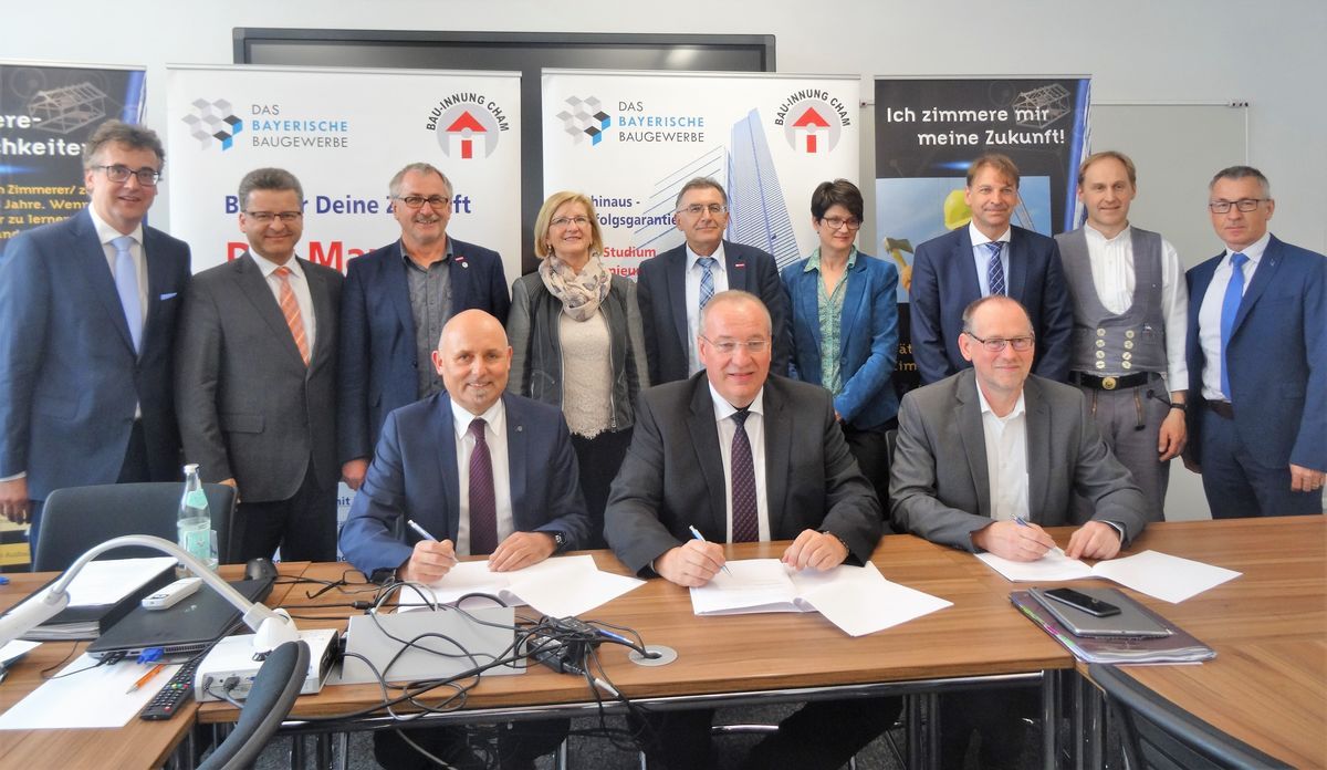 Nachdem die Kooperation mit der OTH Regensburg bereits per Unterschrift besiegelt wurde, unterzeichneten die Verantwortlichen, Landrat Franz Löffler, Schulleiter Siegfried Zistler und Hochschulpräsident Peter Sperber, nun auch eine Vereinbarung für die Zusammenarbeit der Berufsschule Cham mit der Technischen Hochschule Deggendorf.