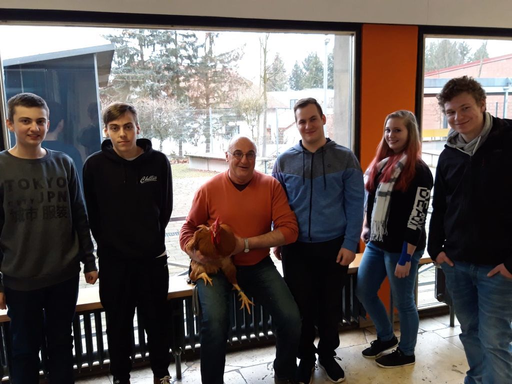 Um ihren Verbindungslehrer einen kleinen Vorgeschmack auf diese weltgrößte Landwirtschaftschaftssausstellung zu bieten, überreichte eine weitere Gruppe von Schülern unter der Regie von Hobbygeflügelzüchter Thomas Treimer (Industriemechaniker, 11. Klasse) ein Prachtexemplar eines New Hampshire Hahnes. Dieser stellte seine Fähigkeiten auch gleich um Punkt 12.00 Uhr durch einen unvergleichlichen Hahnenschrei unter Beweis.