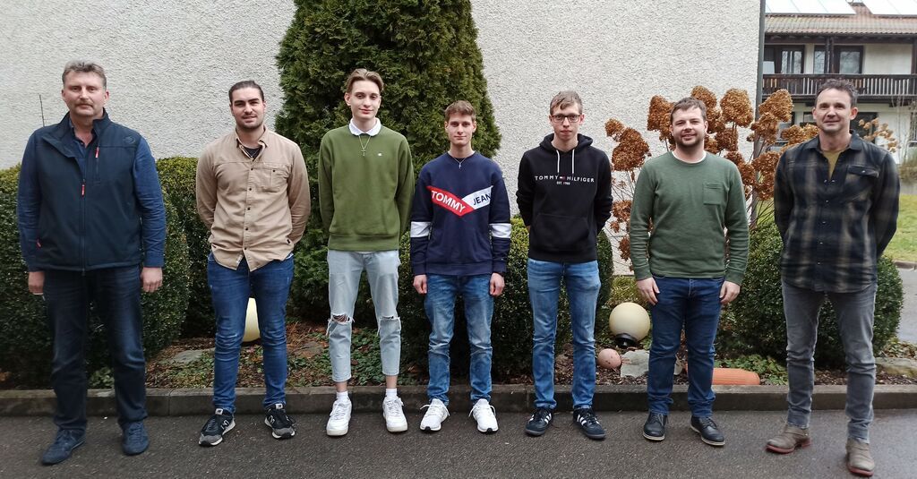(v. l.: Außenstellenleiter Ludwig Wachter, Benedikt Schmidt (Ø1,42, Fa. Dorst), Fabian Ebenschwanger (Ø 1,28, Fa. Crown), Florian Schinabeck (Ø 1,00, Fa. Crown), Lukas Pöschl (Ø 1,14, Fa. P&S), Christian Heimerl (Ausbilder Fa. Crown), Thomas Heuberger (Ausbilder Fa. P&S)