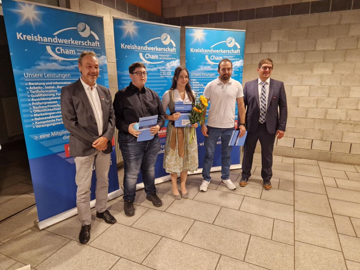 Das Foto zeigt von links nach rechts: Innungsobermeister Elektro Michael Kunz, den Innungsbesten Mittlere Oberpfalz im Elektrohandwerk Matthias Schmidbauer (K+B Elektro), die Absolventin Melissa Semmelmann (Elektro Kunz), den Absolvent Sejdiu Getoar (Elektro Wurm) sowie den stellvertretenden Kreishandwerksmeister sowie Obermeister der Bäckerinnung, Gerhard Blab.