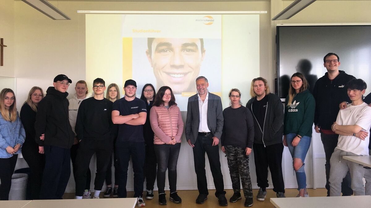 Dr. Rolle von der Akademie Handel, Regensburg machte sich auf den Weg nach Cham, um unseren zwei 12. Klassen aufzuzeigen, wie sie mit der Aufstiegsqualifizierung zum Geprüften Handelsfachwirt IHK Stufen auf der Karriereleiter erklimmen können.