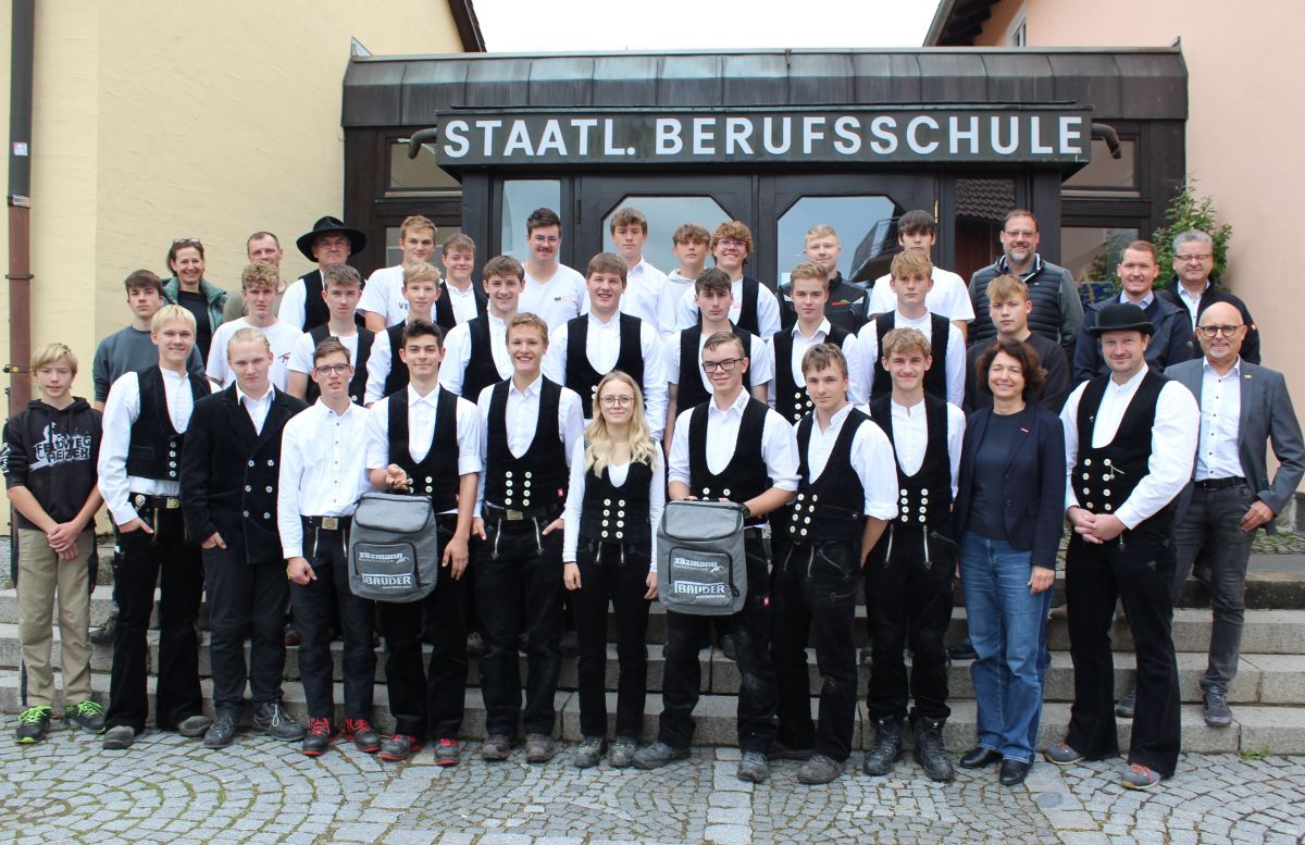 Mit Stolz und großer Freude begrüßten Obermeister Tobias Weber (Zimmerer-Innung Cham), Frau Rosemarie Tragl-Kraus, die Geschäftsführerin der Kreishandwerkerschaft Cham, sowie Schulleiter Siegfried Zistler die 28 neuen Auszubildenden im Zimmerer-Handwerk. Firmenchef Philipp Zitzmann und sein Verkaufsleiter Herbert Göttlinger brachten ein cooles Starterset als Präsent mit nach Furth im Wald. Unsere BGJ’ler freuten sich über den Besuch!