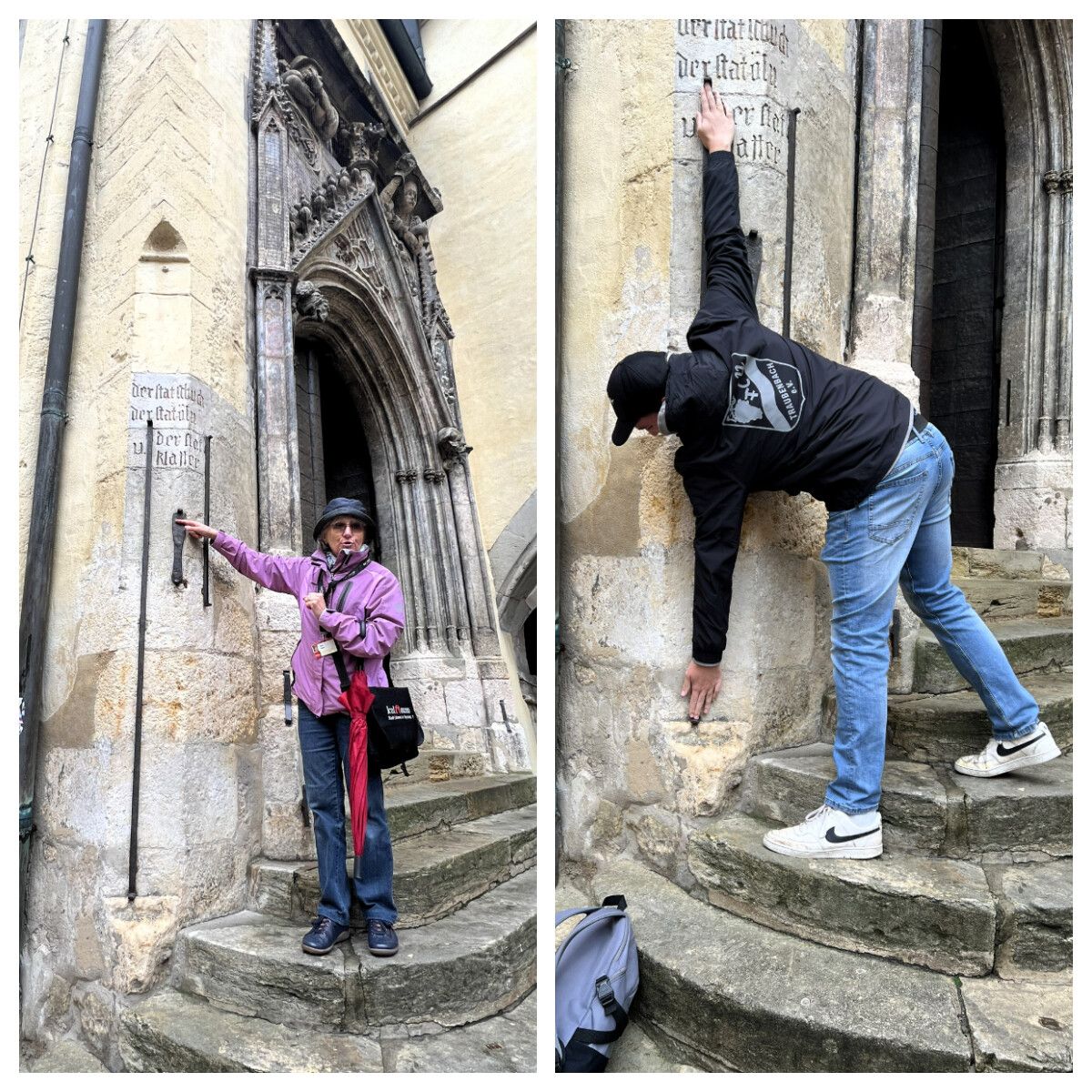 Am Eingangstor zum Alten Rathaus nahmen wir Regensburger Maß: Fuß, Elle und Klafter – und gingen von dort weiter zum Fischmarkt und zur Steinernen Brücke, wo wir die Sage des Bruckmandls wieder aufleben ließen.