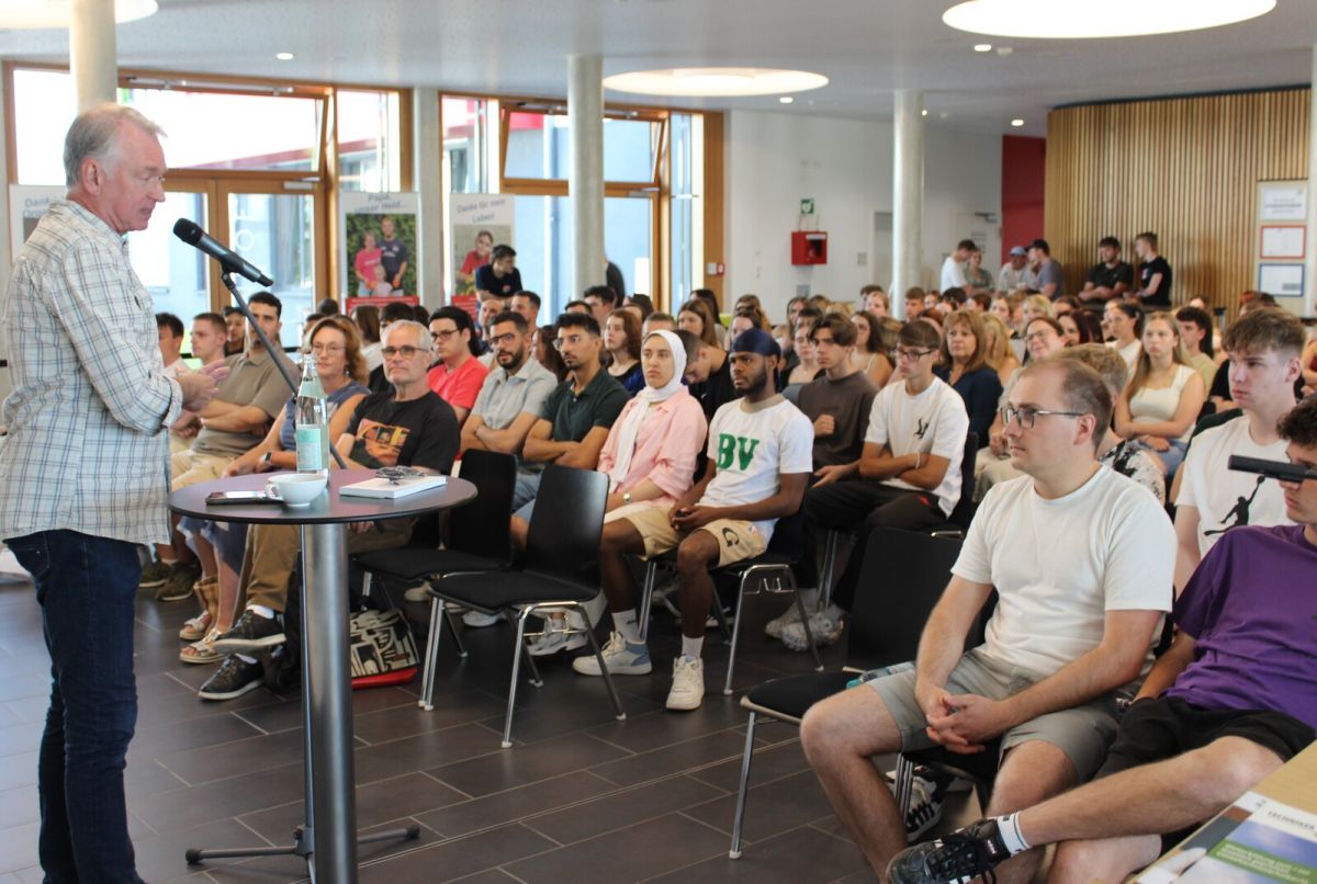 Bis auf den letzten Platz besetzt ist die Aula am Mittwoch, den 25. Juni, 200 Zuhörer folgen den Ausführungen aufmerksam. Springers Credo: Wir werden unsere Zukunft nur dann positiv gestalten, wenn wir offen und tolerant sind, wenn wir zuhören und auch mal andere Meinungen akzeptieren, wenn wir nicht alles glauben, was uns vorgesetzt wird, sondern Aussagen hinterfragen und, das ist ihm ganz wichtig, wenn wir unsere Demokratie schätzen und verteidigen! Es stimmt, Demokratie ist nicht immer super, Demokratie hat auch Nachteile. Beispielsweise dauern Entscheidungen oft ewig und am Ende entscheidet die Mehrheit und die Minderheit fällt unter den Tisch. Wenn man sich allerdings in der Welt umsieht, all die Autokraten und Diktatoren, die immer mehr werden, betrachtet, dann müssen wir begreifen: Unsere Demokratie ist das Beste, was wir haben, und wir müssen sie mit allen Mitteln verteidigen!