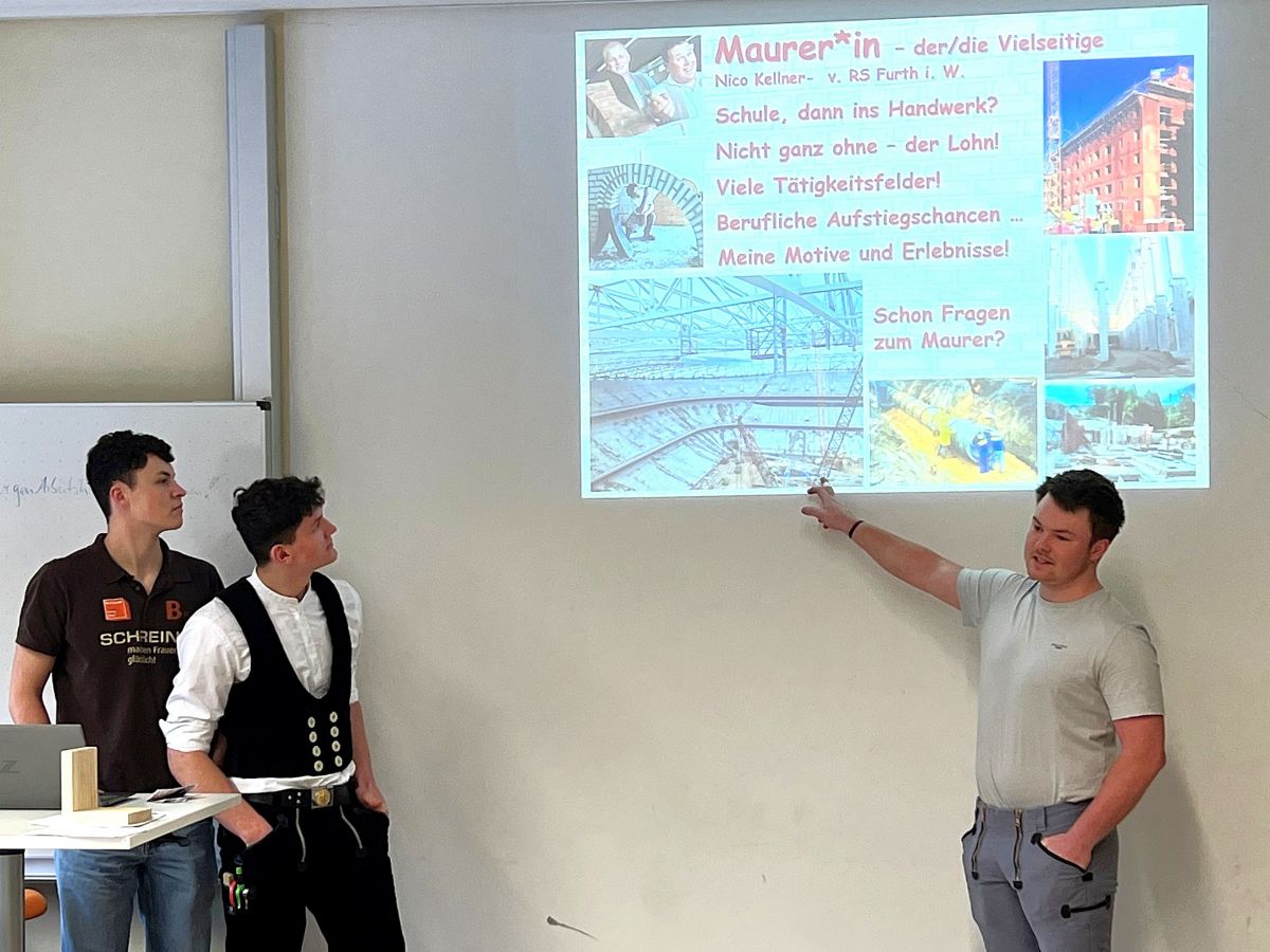Beim Berufsinfotag am 21.01.2026 stellten unsere Schüler Nico Kellner (Maurer), Leo Gschwendtner (Schreiner) und Max Nachreiner (Zimmerer) ihre Ausbildungsberufe vor.