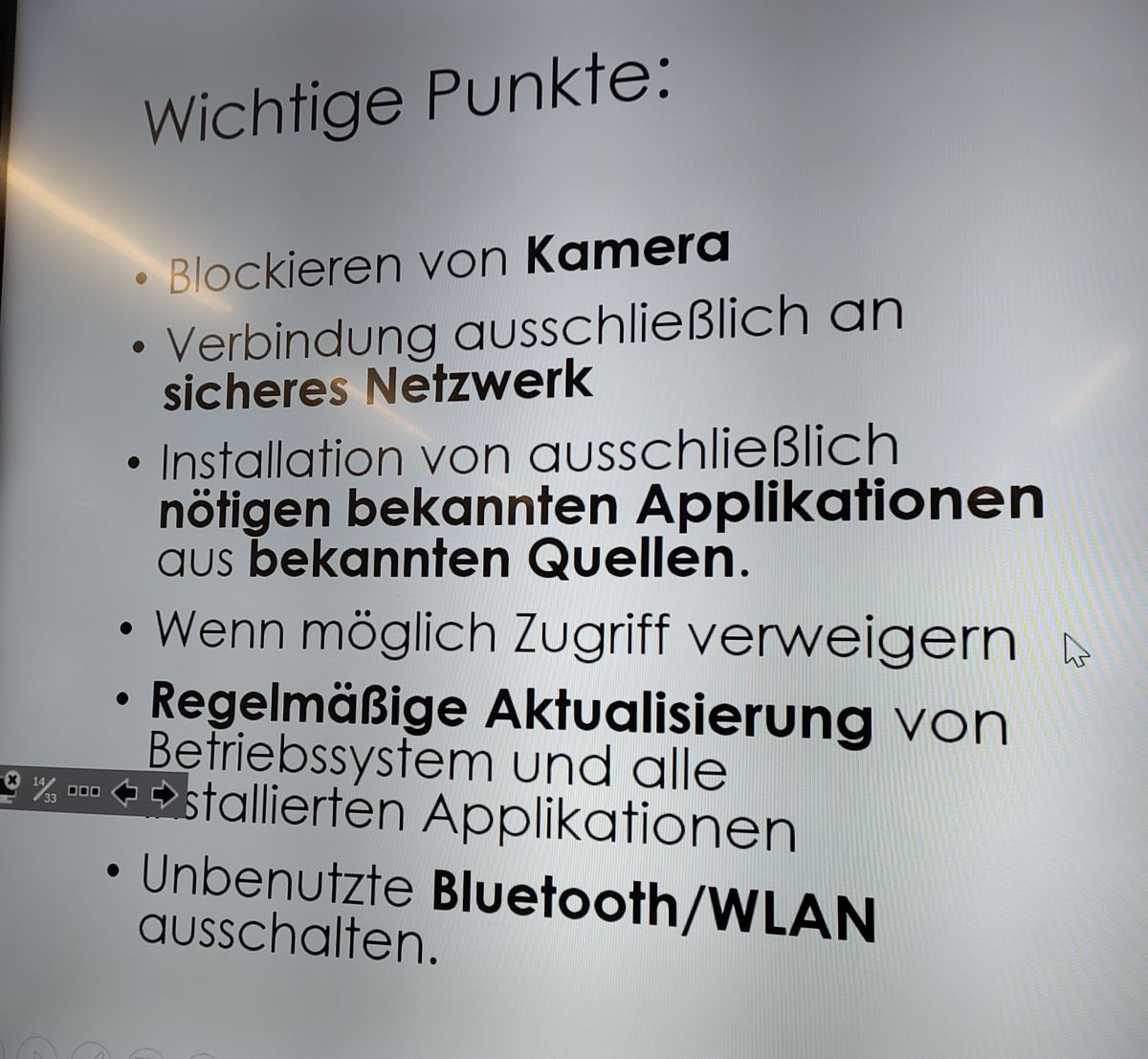 Über Mentimeter konnten die Schüler ihre Einschätzung zum Thema „Wie sicher ist der Staat, sind unsere Unternehmen, sind wir Bürger?“ abgeben. Anschließend konnten die Schüler in einem geschlossenen Netzwerk mit ihren Tablets ausprobieren, wie einfach es ist, auf die Kamera eines anderen Gerätes zuzugreifen bzw. Passwörter zu knacken. Derart sensibilisiert bekam das Thema Cybersicherheit eine ganz neue Bedeutung. Nima erklärte nun ausführlich, was man tun muss, um im Netz sicher zu sein.