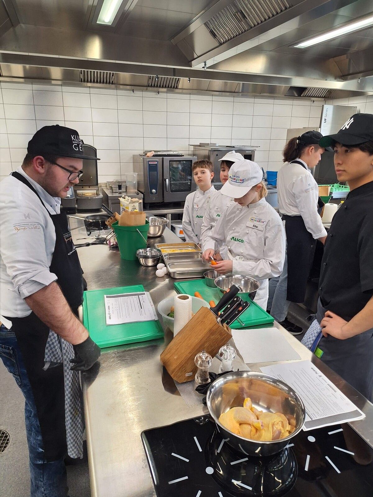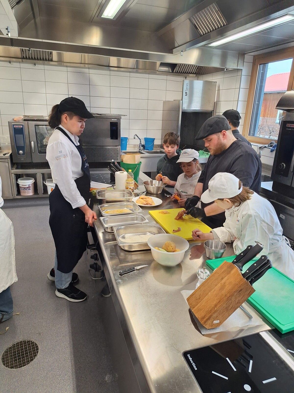Auf dem Menüplan stand ein knuspriges Backhendl mit Kürbis-Cornflakes-Kruste und Kartoffel-Endivien-Salat sowie Saltimbocca mit Pastinaken-Kartoffelpüree und glasierten Karotten. Ausgestattet mit Kochjacke, Halstuch, Schürze und Basecap fühlten sich die jungen Teilnehmer wie echte Meisterköche. In der hochmodernen Lehrküche wurde geschnippelt, gewürzt und gebraten – stets unter professioneller Anleitung. Dabei bewiesen die Berufsschüler nicht nur fachliches Können, sondern auch bemerkenswertes pädagogisches Geschick. Geduldig erklärten sie Arbeitsschritte, gaben Tipps und motivierten den Nachwuchs.