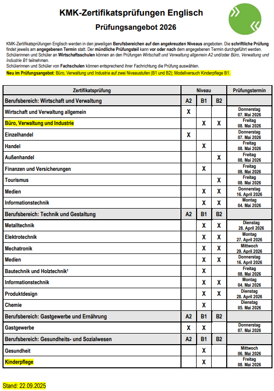 Ab dem Schuljahr 2025/2026 wird das Prüfungsangebot der Bereiche Büro & Verwaltung sowie Industrie überarbeitet. Die neue Prüfung "Büro, Verwaltung und Industrie" wird auf den Niveaustufen B1 sowie B2 des Gemeinsamen Europäischen Referenzrahmens für Sprachen (GER) angeboten.