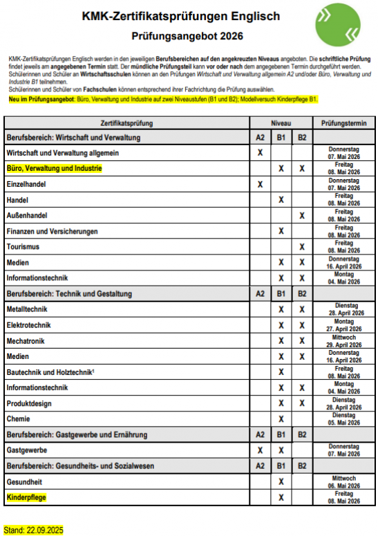 Ab dem Schuljahr 2025/2026 wird das Prüfungsangebot der Bereiche Büro & Verwaltung sowie Industrie überarbeitet. Die neue Prüfung "Büro, Verwaltung und Industrie" wird auf den Niveaustufen B1 sowie B2 des Gemeinsamen Europäischen Referenzrahmens für Sprachen (GER) angeboten.